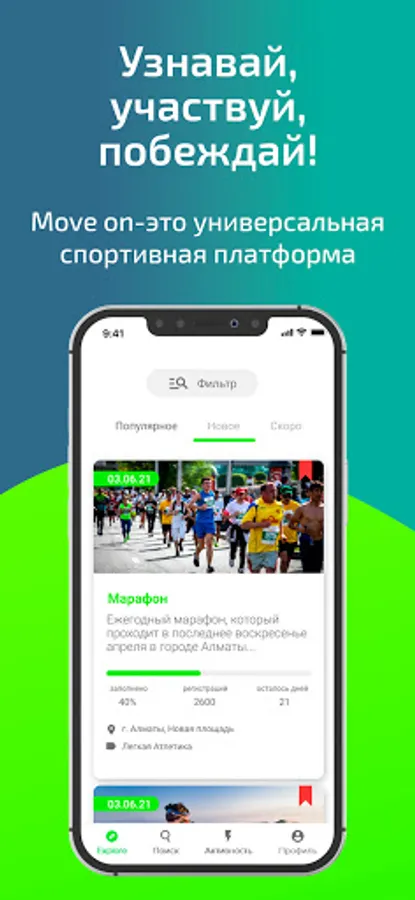 Move On is an application that brings together all the city's sports events in one place, with the ability to quickly register, pay in one window and communicate with the organizers of the event. We have not forgotten about the organizers, because with Move On you can organize events of any complexity.