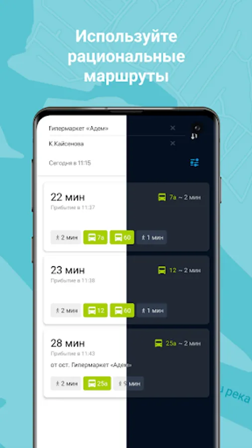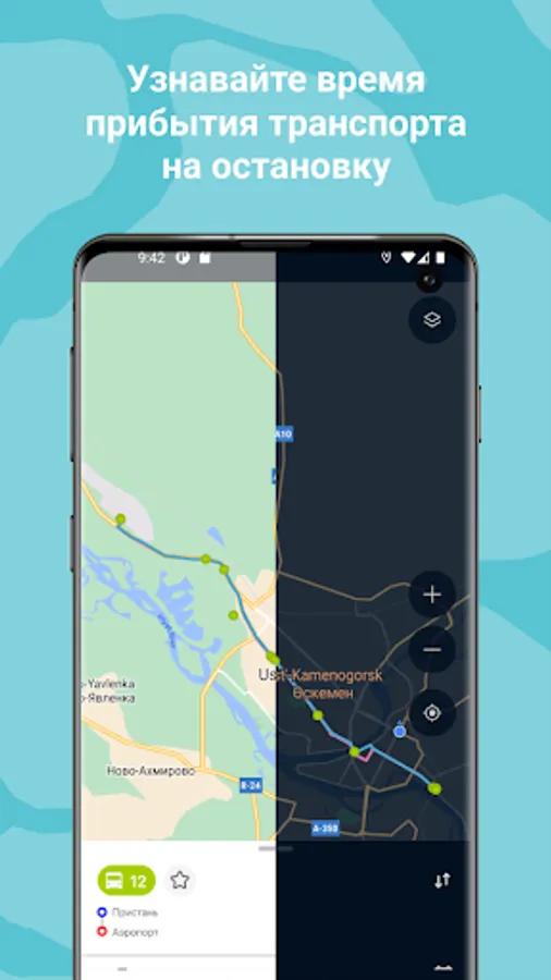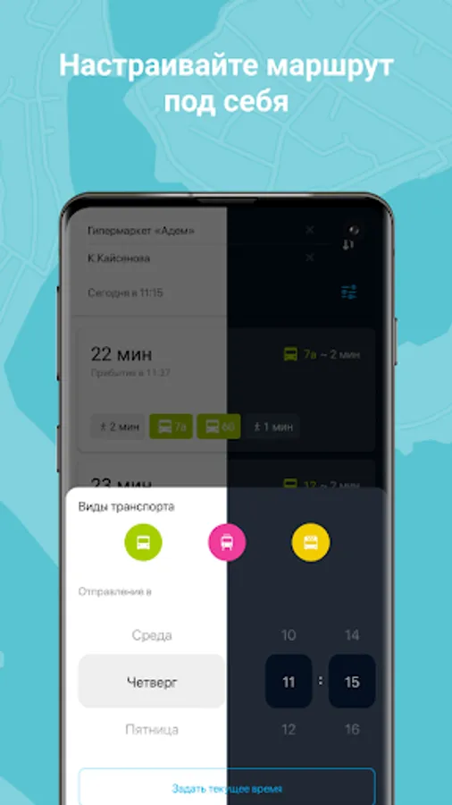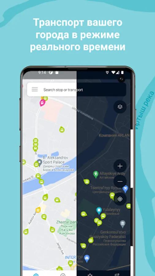 Plan your route using the app, taking into account the types of public transport that are suitable for you - bus, tram and route taxi. To build a route, choose your current location, a bus stop or just a place on the map.