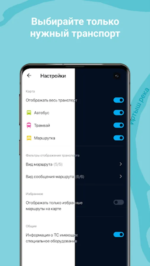 Want to see only certain modes of transport on the map? Choose the ones you need in the Settings. Also, in Settings, you can enable the display of only important routes that are added to Favorites. Customize the application as convenient as possible.