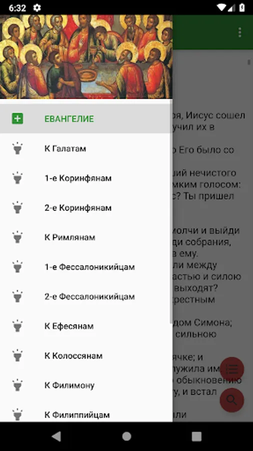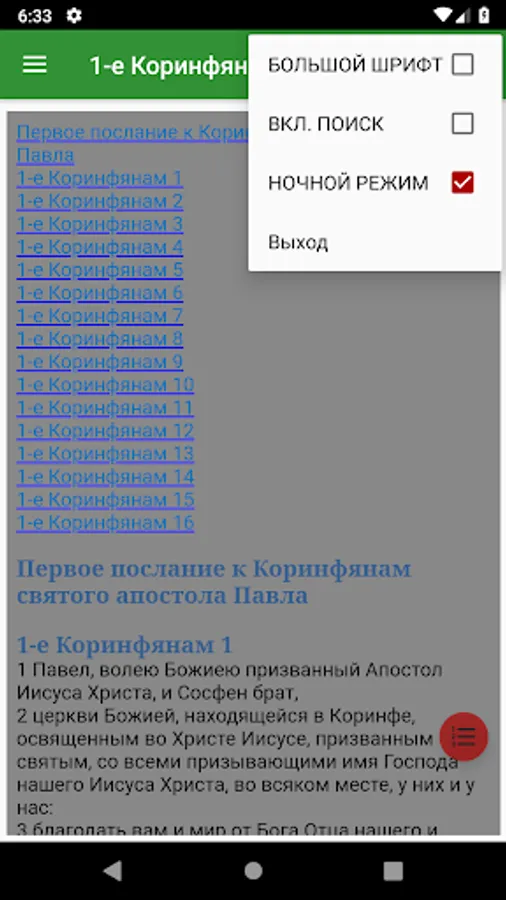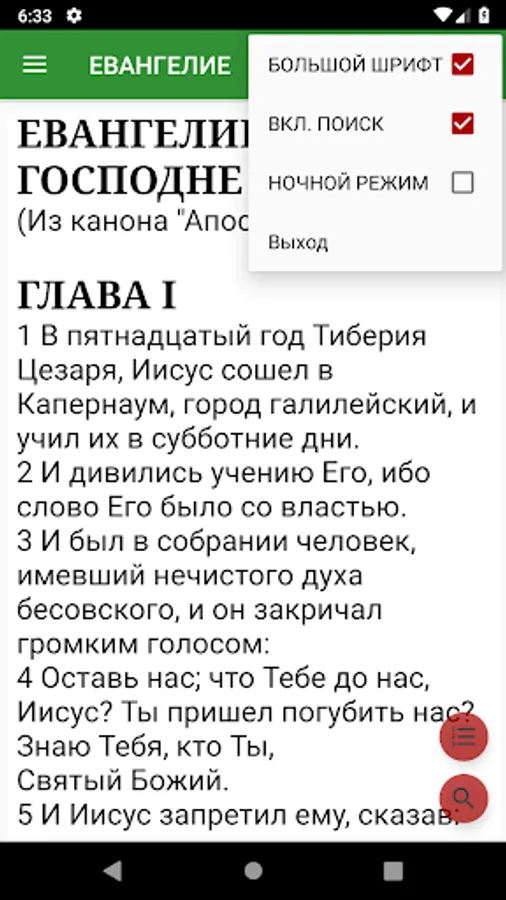The program provides for viewing the Bible, searching for information in it, as well as selecting and copying text fragments. In the program menu, you can select the desired font size, night reading mode, as well as disable the search button.