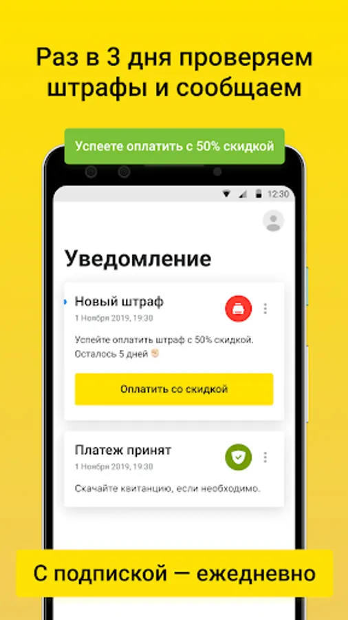 Also, with the help of OKauto, you can receive information about new fines in a timely manner by push-notification and pay them at a discount of 50%.