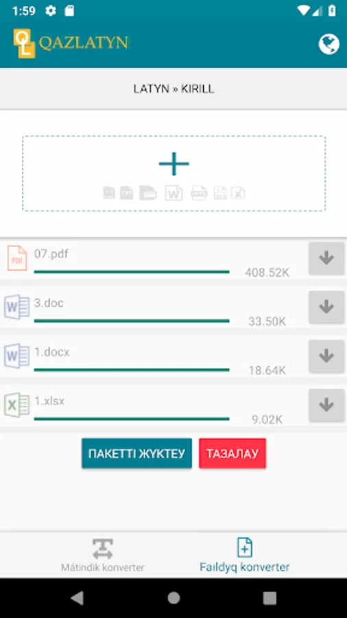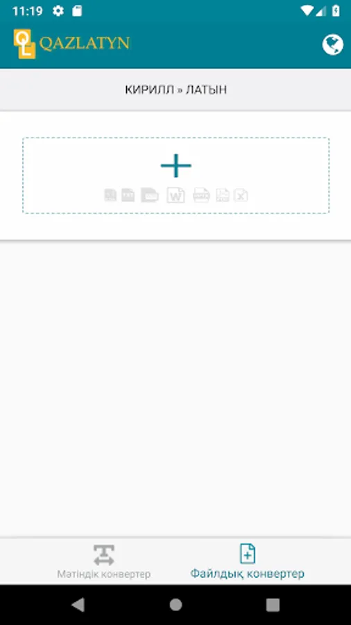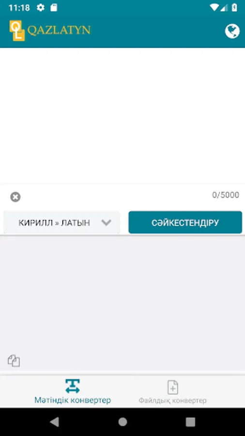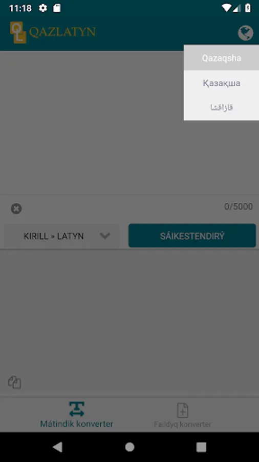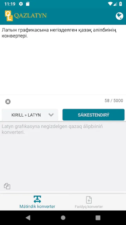 Qazaq tilindegi mátindi nemese qazaq tilindegi mátini bar faıldardy kırıllısadan latyn grafıkasyna konvertasıalaý úshin telefondy nemese planshetti paıdalanyńyz. Android júıesine arnalǵan qosymsha .doc, .docx, .rtf, .xls, .xlsx, .ppt, .pptx, .txt, .html, .pdf formatty qazaq tilindegi mátini bar faıldardy kırıllısadan latyn grafıkasyna konvertasıalaýǵa múmkindik beredi.