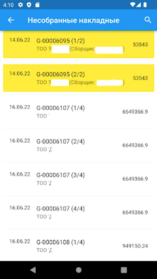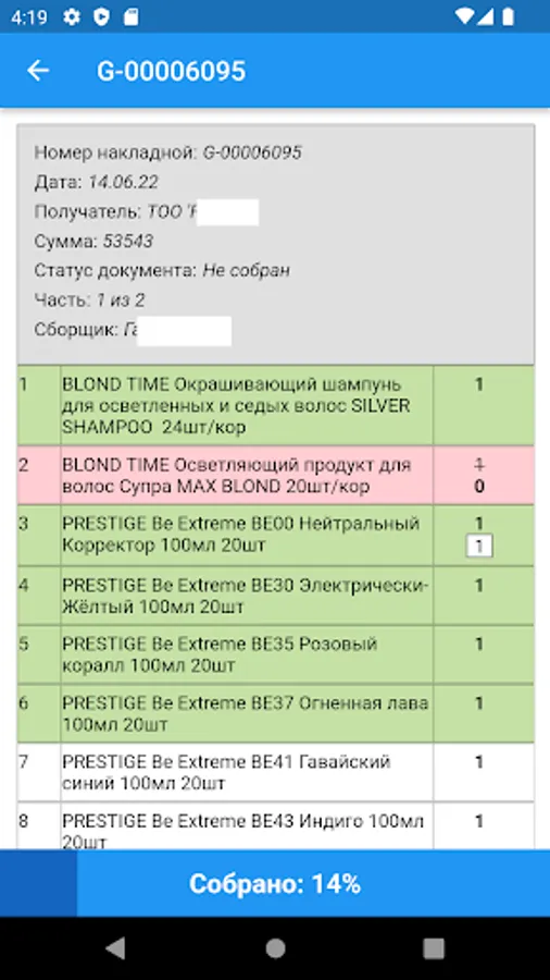 - The user sees the assembly progress bar for this invoice. After 100% collection of the invoice, the storekeeper confirms this, the invoice receives the status "Collected", is saved on the device and sent to the server;
