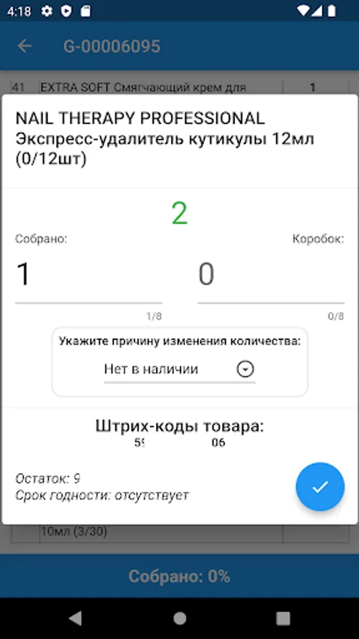 - It is possible to specify the number of boxes. The assembled product is highlighted in color. If there is a discrepancy in quantity, the storekeeper changes the quantity and indicates the reason for the discrepancy. A position collected with a discrepancy is highlighted in a different color;