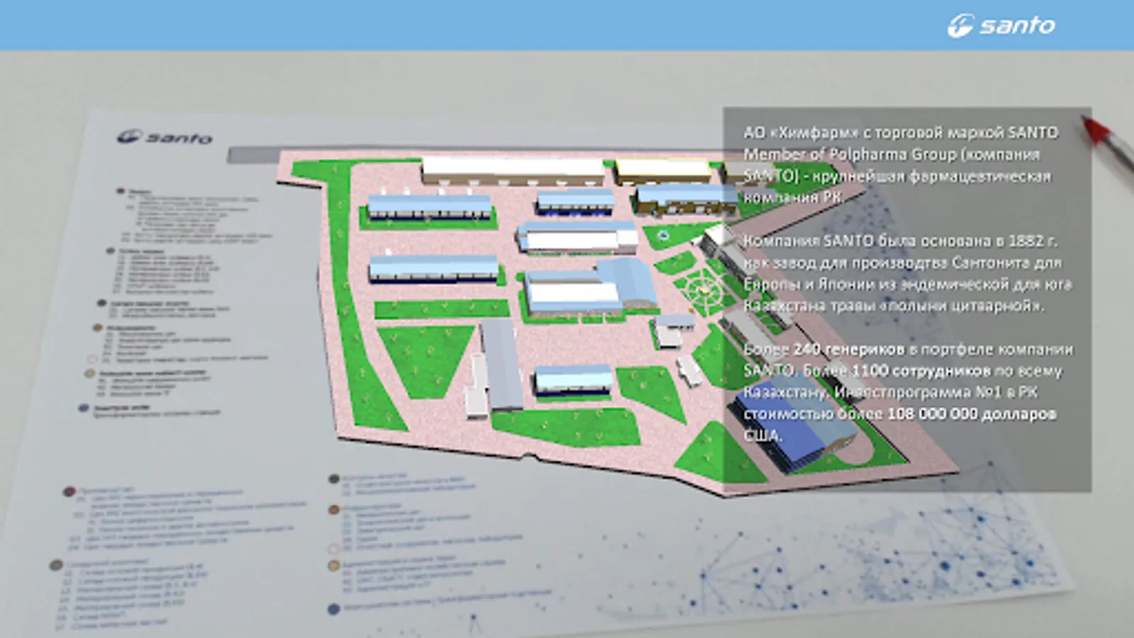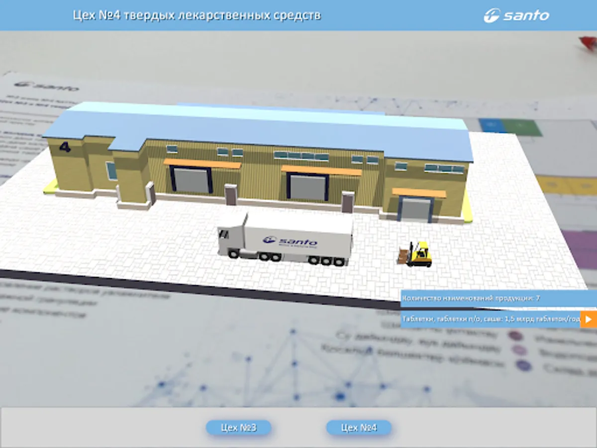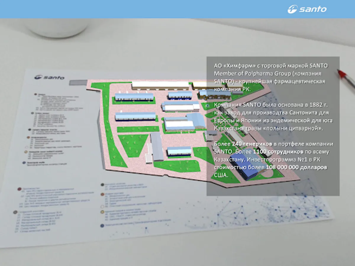 SANTO Plant Tour позволяет смотреть процесс производства лекарственных средств и объемные схемы цехов завода в дополненной реальности. Приложение работает только совместно с официальным буклетом.