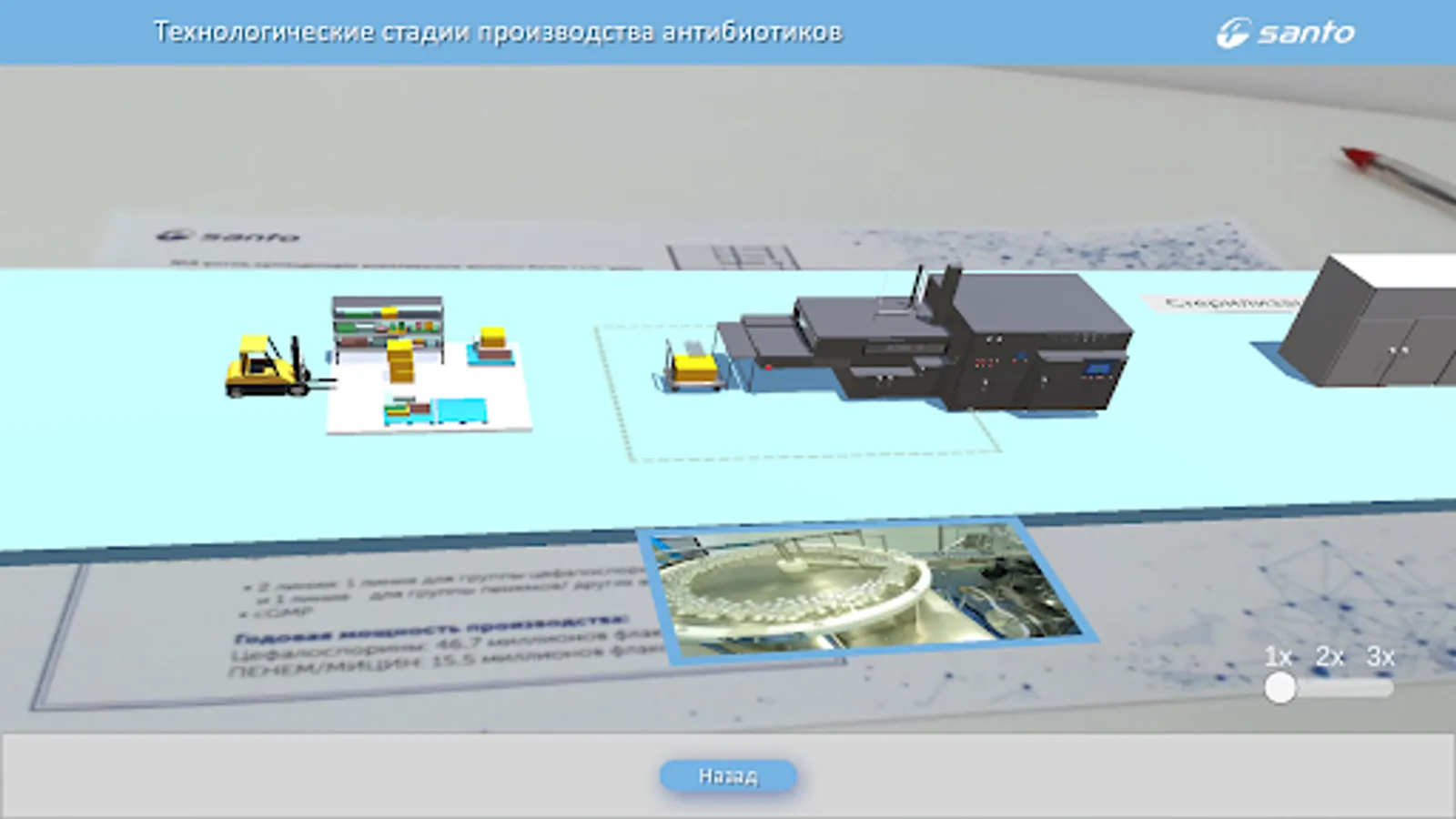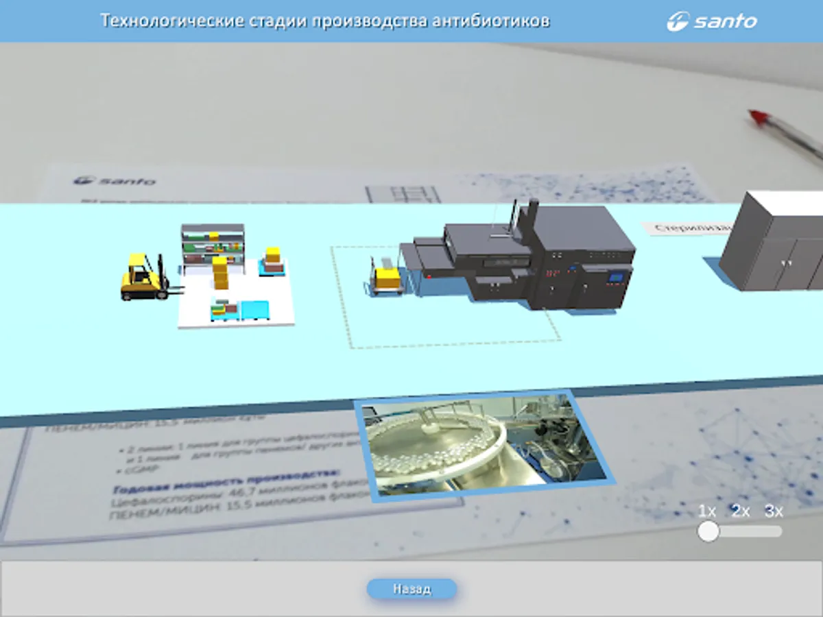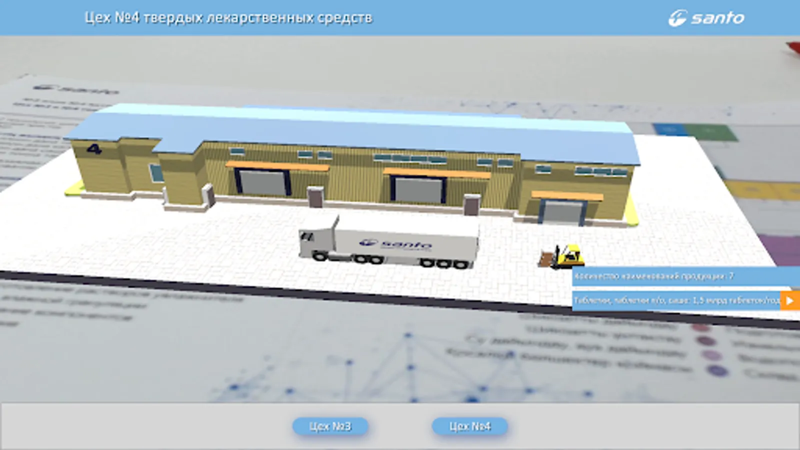 SANTO Plant Tour позволяет смотреть процесс производства лекарственных средств и объемные схемы цехов завода в дополненной реальности. Приложение работает только совместно с официальным буклетом.