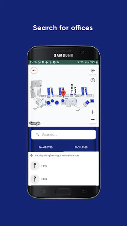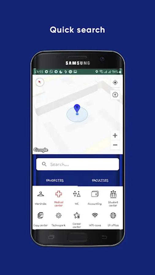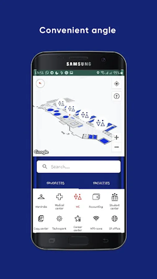 Using the search function, you can find the desired object on the campus map (auditorium, dean's office, library, centers, departments, etc.) or view a list of all objects in Favorites or Faculties. The application allows you to indicate your location relative to a given object, supports the "guidance" of the user on the map to the point of interest.
