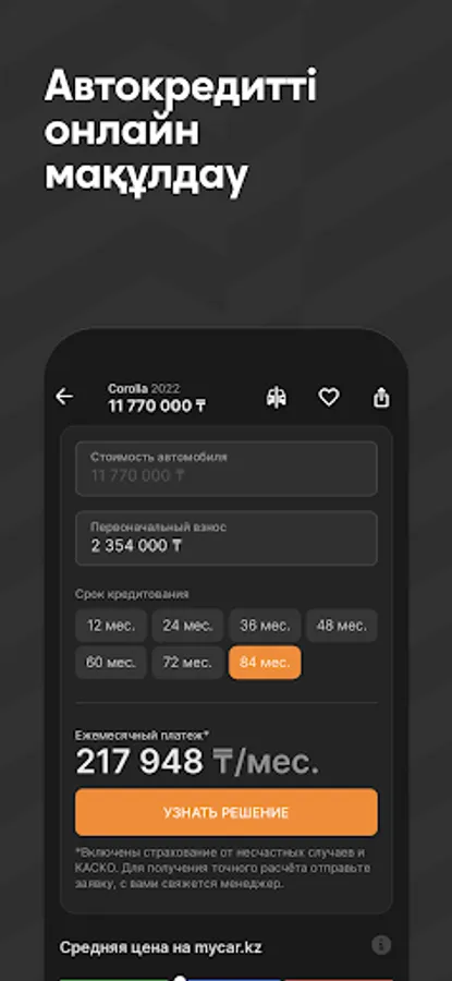 Mycar.kz is a multifunctional tool and ease of use for all car enthusiasts! View ads, choose, compare packages, book a car online, apply for a loan, get approved in 1 minute and track the status of car loan payments.