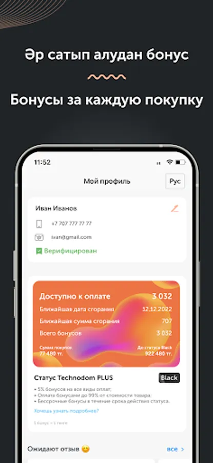 In your personal account, you can find out the number of remaining bonuses in the Technodom PLUS privilege club and the closest date of their expiration, the history of your orders and other useful information. The Technodom PLUS loyalty program is a guaranteed cashback of 2% for purchases in installments or a loan, 3% for purchases in cash or when paying with a card from the first purchase with the Orange member status.