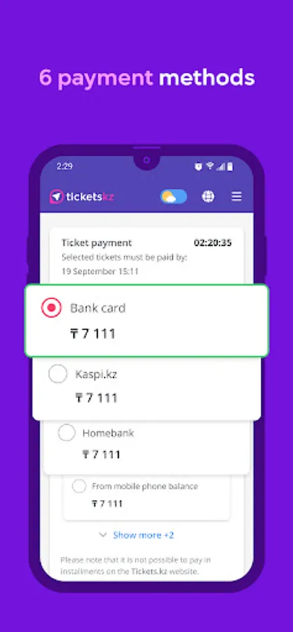 You may buy the ticket with your credit/debit card. The price includes all fees and taxes, with no hidden payments. In addition, there are 6 payment methods available in our app, so you will definitely find a comfortable way to pay.