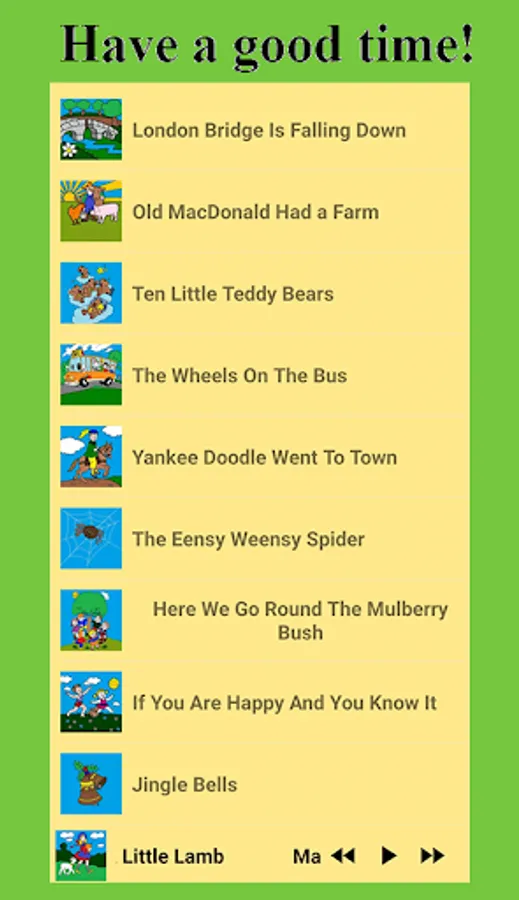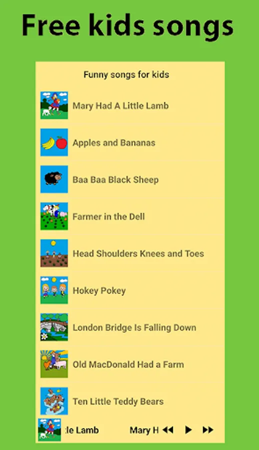 The application "Kids songs" is completely free and works without the Internet. Your kid can choose any song he likes by clicking near the colorful picture. The songs are suitable for both boys and girls.