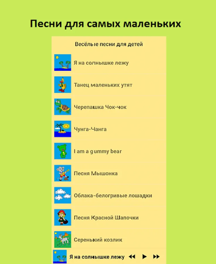 Children's songs for kids. A collection of popular funny songs from your favorite cartoons, both modern and Soviet for your beloved children. The Baby Songs app is ad-free and works offline. Your kid himself will be able to choose any song he likes according to a colorful picture and turn it on. The songs are suitable for both boys and girls.