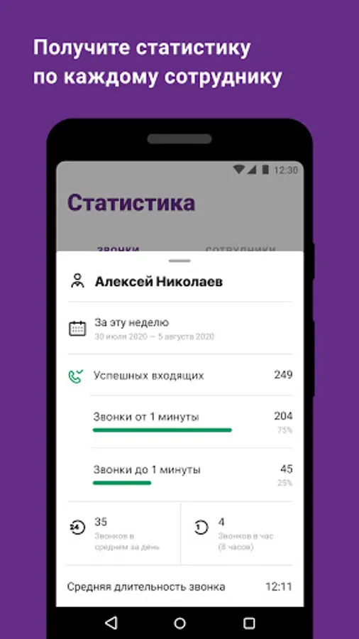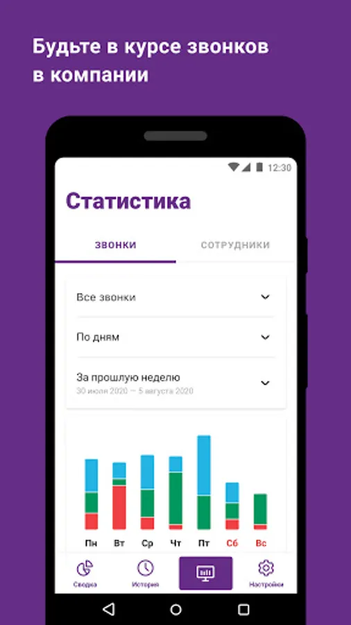 - следите за статистикой по звонкам за произвольный период и по любому сотруднику;