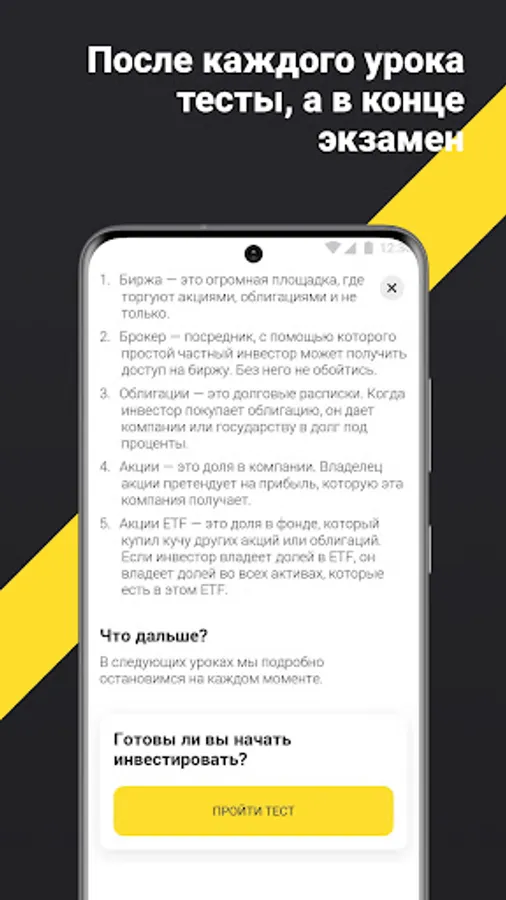 Having understood the mechanics of the stock market and its tools, you will understand how not to lose money, but to increase your investments. The main task when investing is to preserve your finances and protect capital. After completing all the lessons in our application, you will learn how to properly manage investments in stocks and bonds in the long term.
