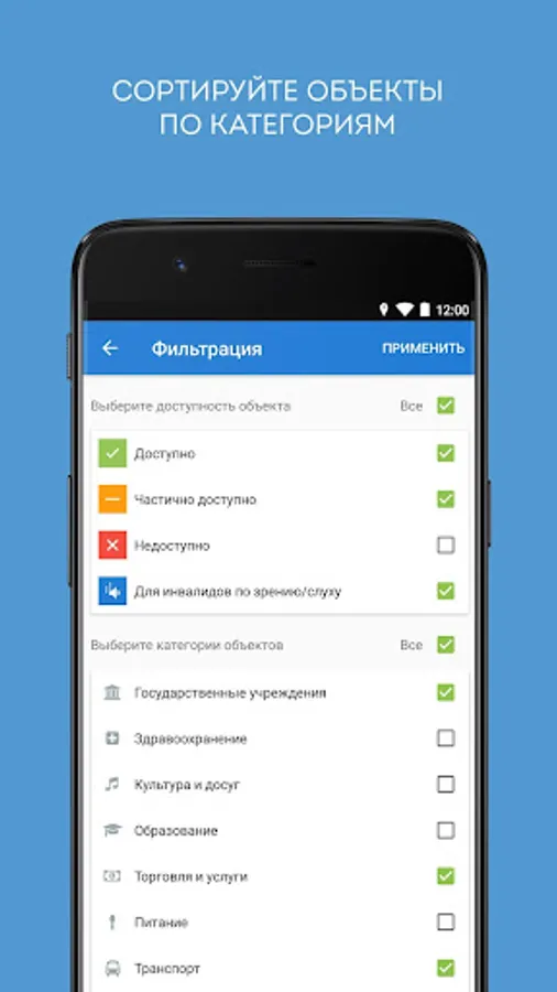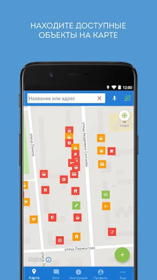 The availability of objects on the map indicated by the traffic light system: green icon indicates a fully available objects, yellow icon - partially accessible objects, red icon - inaccessible objects, the blue icon on the map shows the objects that are adapted for people with disabilities, visually impaired and hearing.