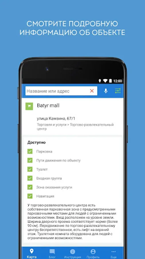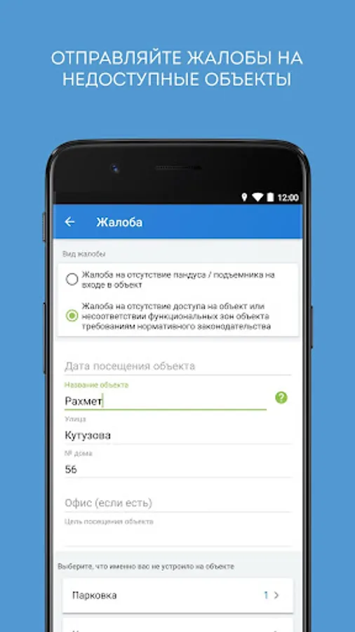 In addition, , the application has the opportunity to file a complaint against any object, if it is completely or partially missing access for people with limited mobility.