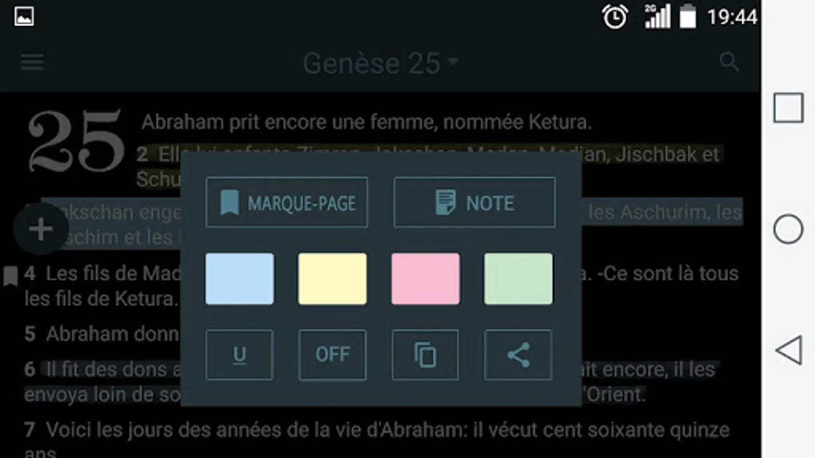 * Share the Bible verse or several verses via Google+, Facebook, Twitter, email, SMS and etc.