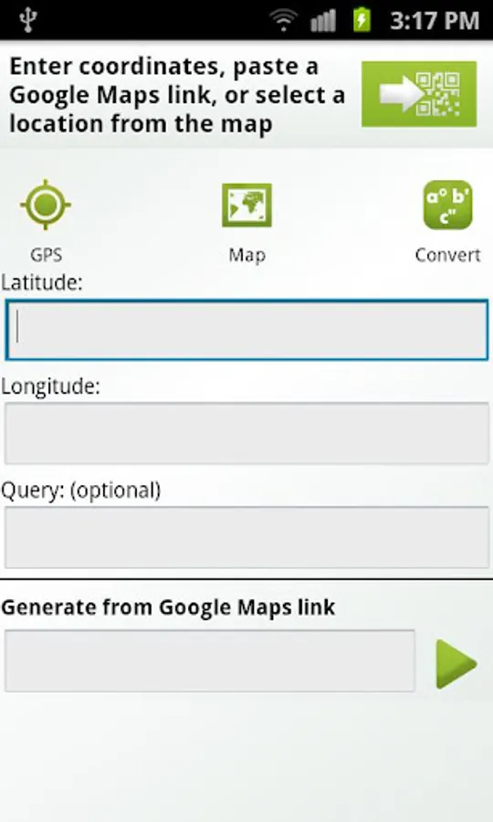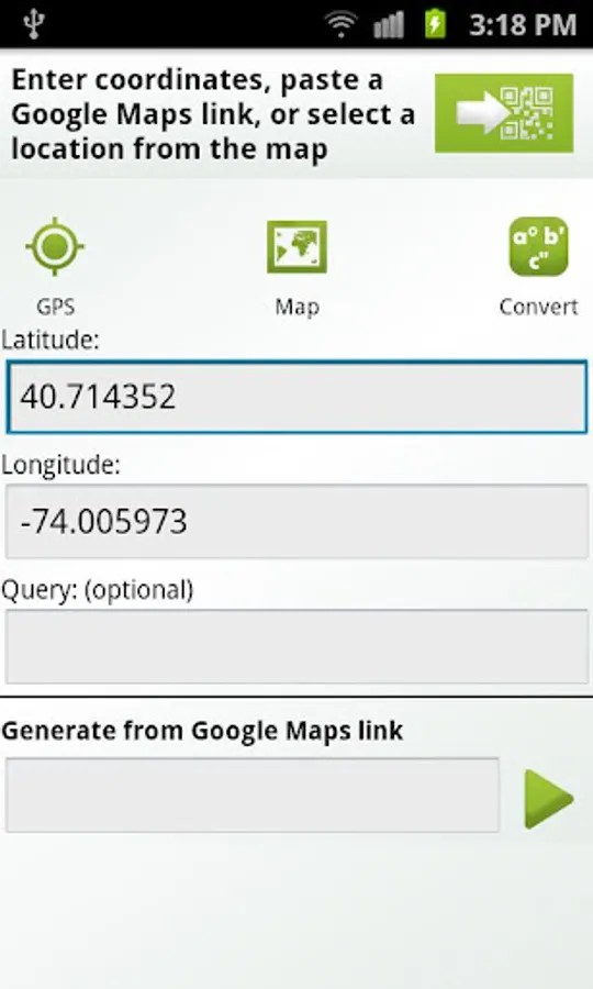 QR-GPS is a Plugin for popular app QR Droid. It adds ability to create a QR code from your current location, using your GPS or Network providers. Then, you can share that location easily.