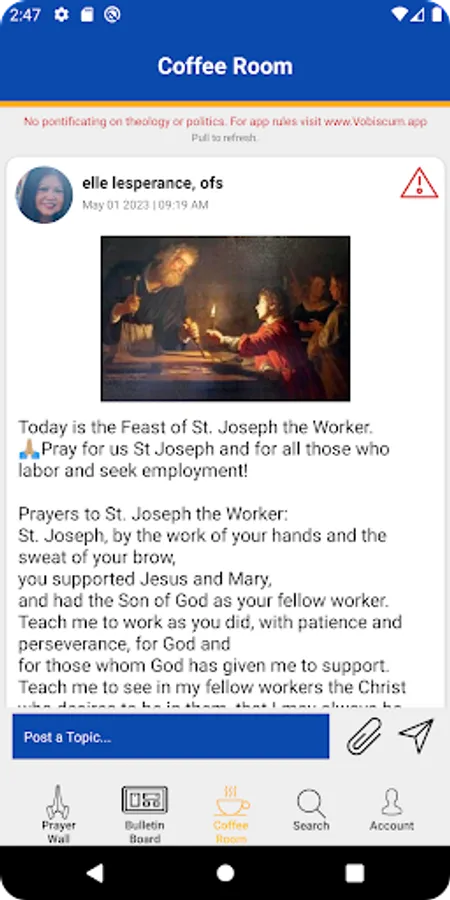 - A Prayer Wall where prayer requests can be posted and users can pledge to pray a "Spiritual Bouquet" for each intention.