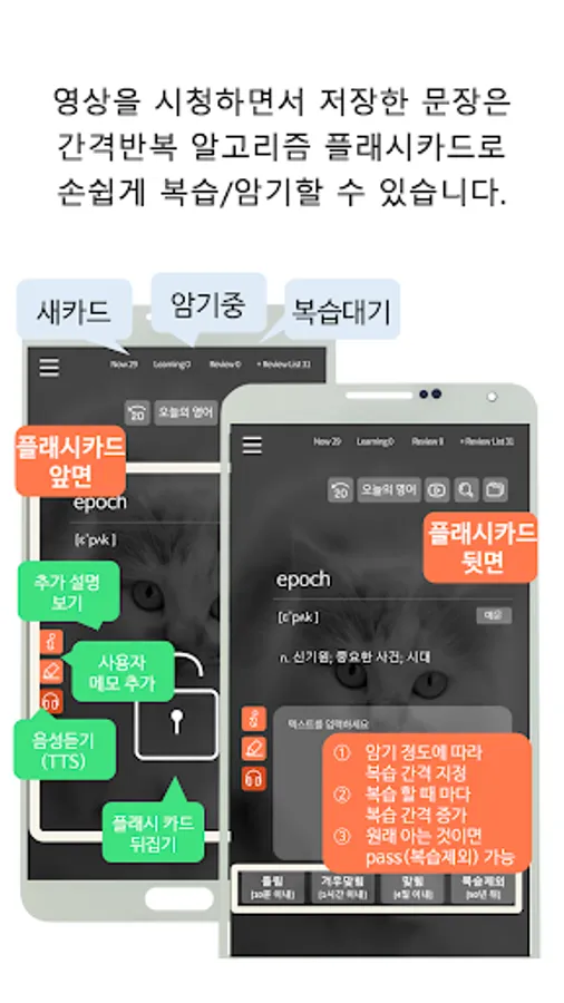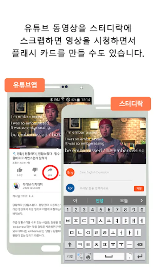 You can watch videos on YouTube videos selected from English grammar lectures, conversation lectures, and dramas, and then save the related expressions and memorize them with the ANKI algorithm.
