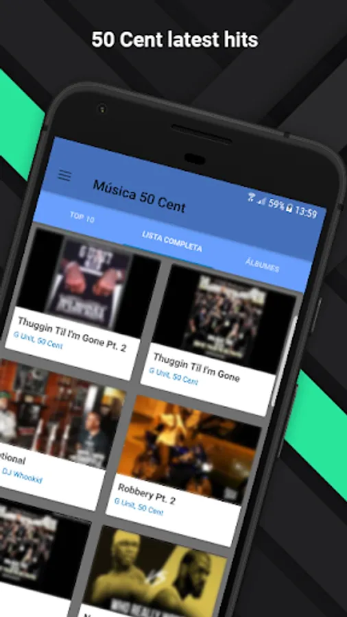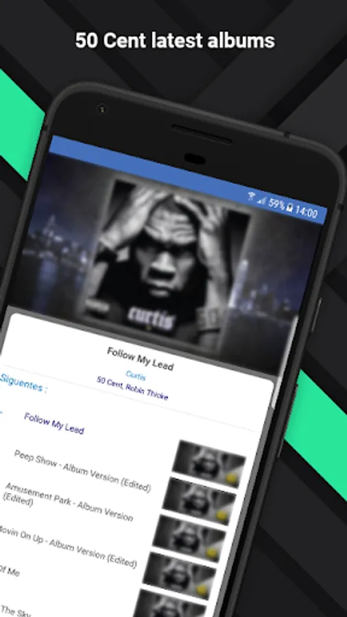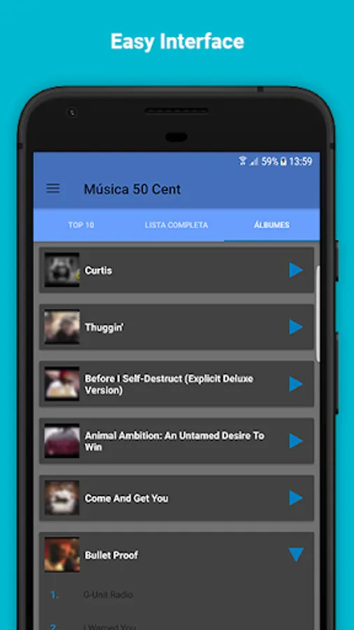 And if you think our app will be difficult, at all. Because it is designed intuitively, so you can get the information and songs that you like the most, in an easy way. We do not want to distract you with thousands of folders. With this app you will get quick access to the albums of your career and to each of your singles, to play them whenever you want. Now that you have this opportunity, do not let it escape and make the music of 50 cent accompany you everywhere.