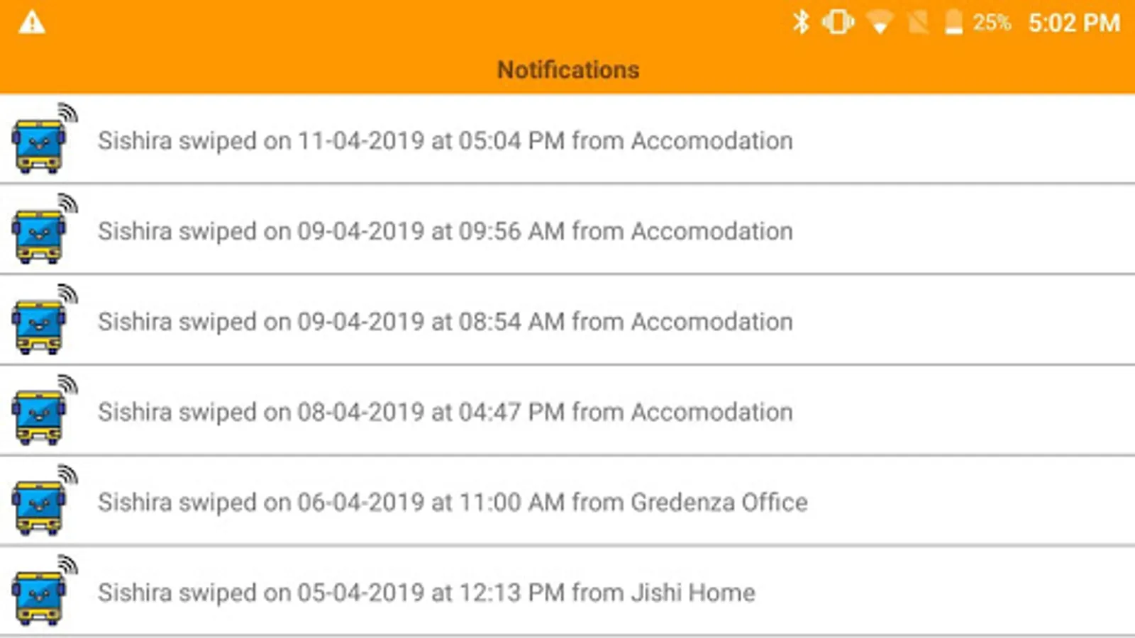 RFID based smart attendance app that allows parents to monitor the attendance of their wards going to school in a school bus. The child getting into the bus from home, reaching the school, getting into the bus from school and getting down at the bus stop near the home are all recorded and updated real time in the app. The real-time movement of the school bus in which their child is traveling can be monitored on a map in the app.