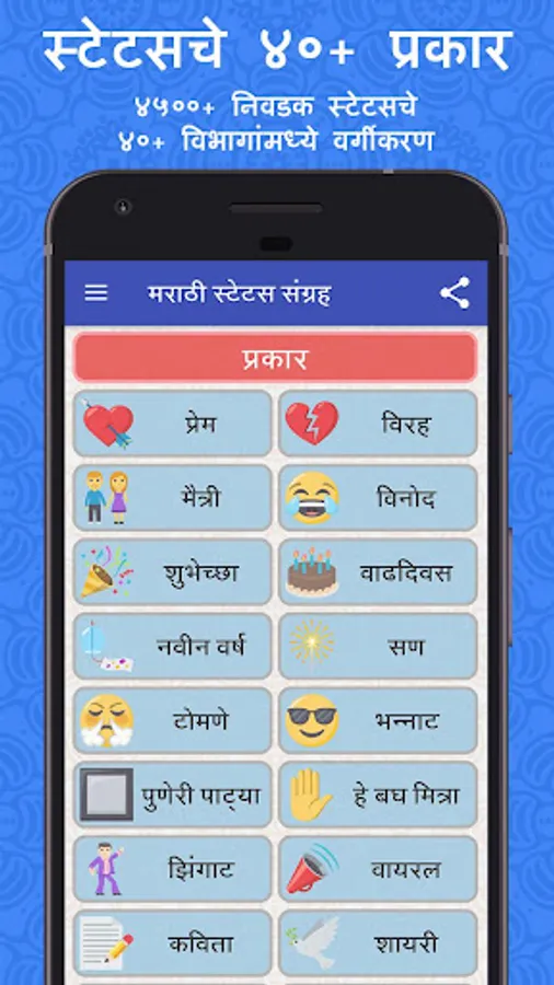 It includes various categories like Marathi shayari, marathi love status, birthday wishes in marathi, status in marathi one line, shivaji maharaj status and much more ...