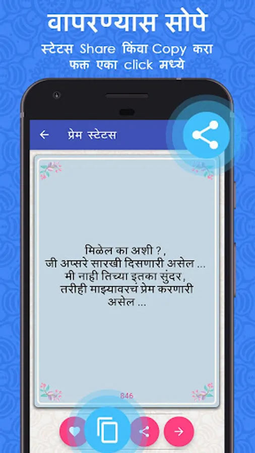 To help you in such a situation, we have created this application, which will make you the master of Marathi status and Marathi SMS. So that, you can impress others by your sheer knowledge.