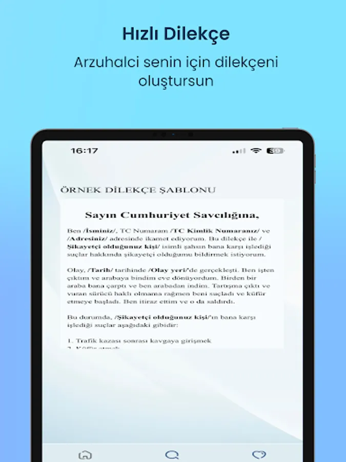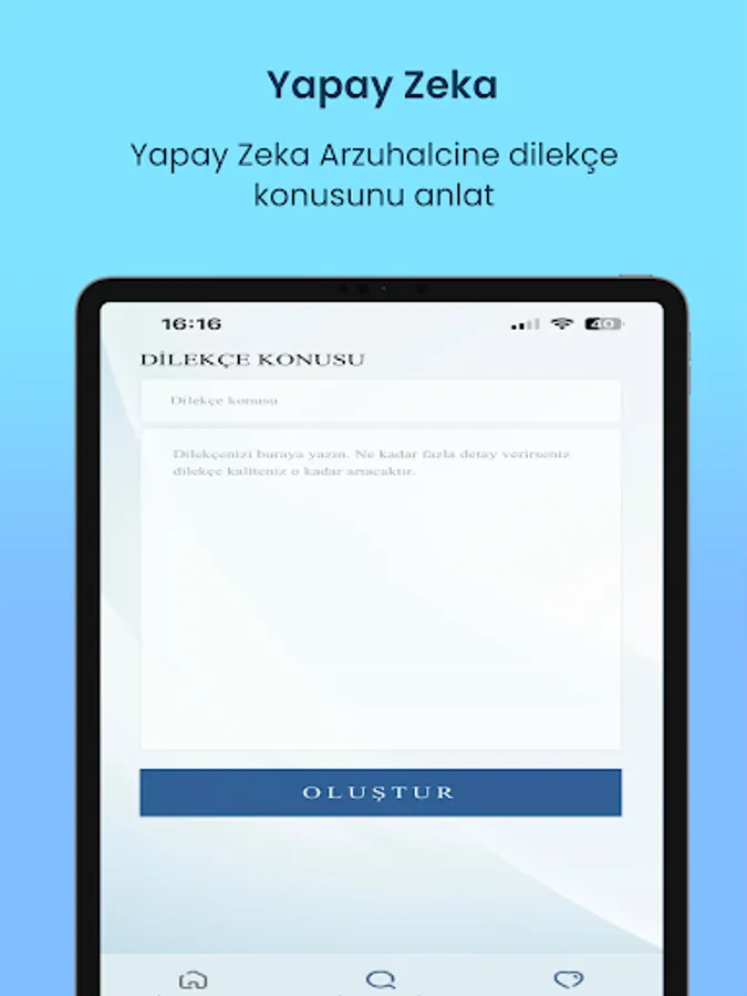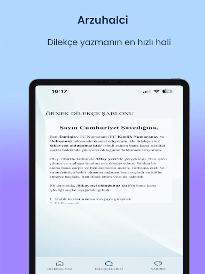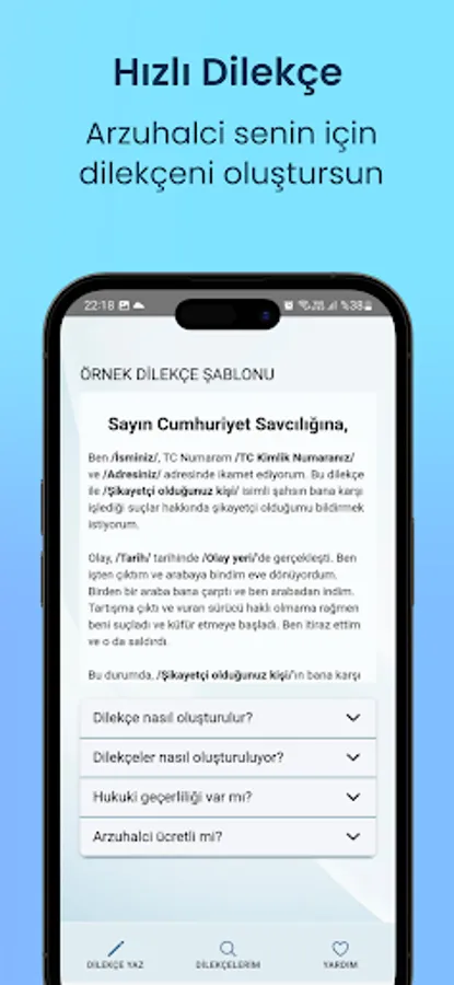 "Arzuhalci - Petition Yazici Pro", as an Artificial Intelligence supported application, helps you solve your official, legal or personal petition needs in the fastest and most effective way. This smart app understands complex legal texts and creates a petition tailored to your needs in seconds.
