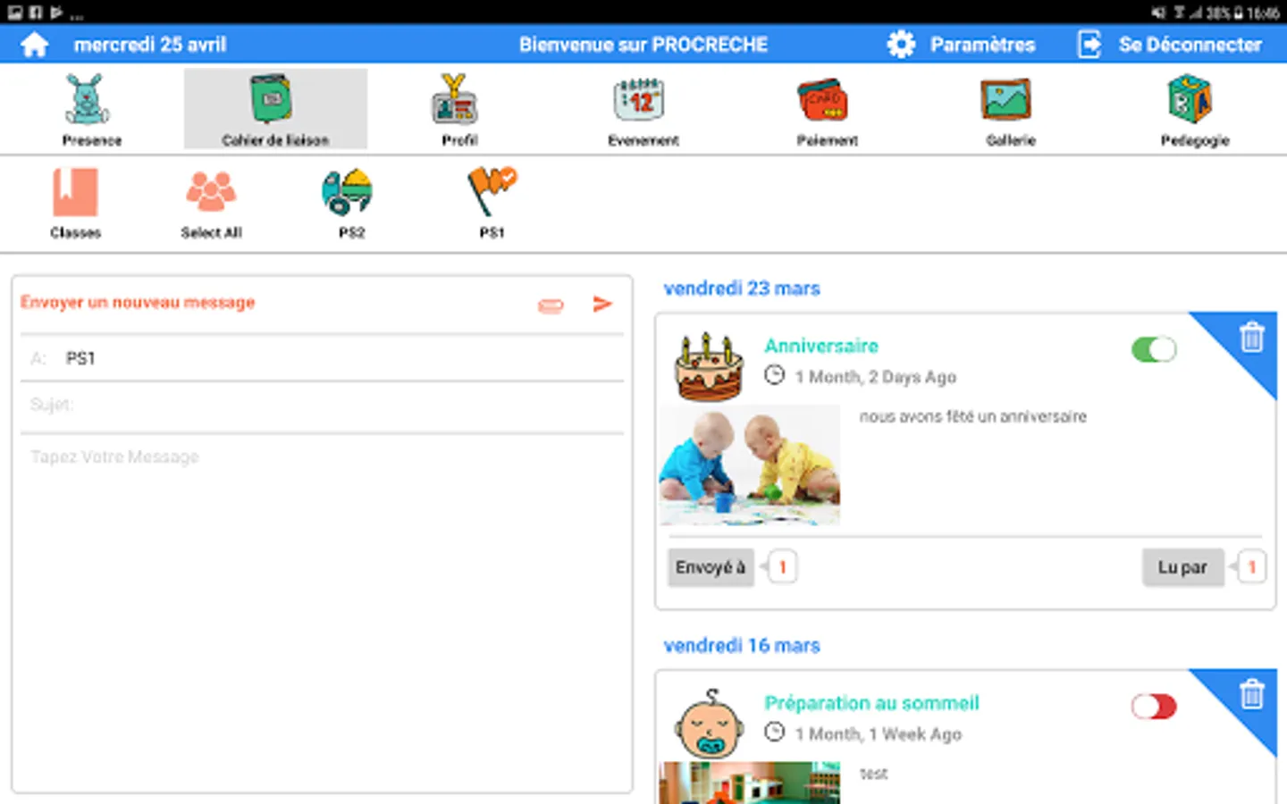 You will be informed of the main activities: important messages, the educational program, the evolution of your child, the highlights (photos, educational activities, ...), upcoming events (educational outings, carnival, school holidays, ...), the canteen menu, our internal regulations, and even educational information that will help you better understand the world of nursery and early childhood.