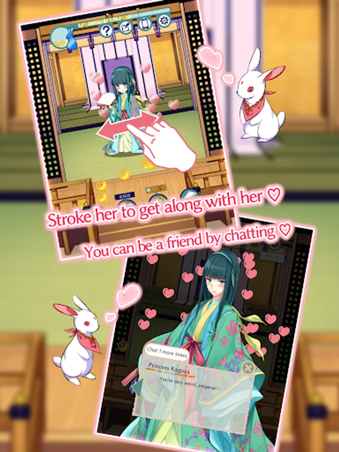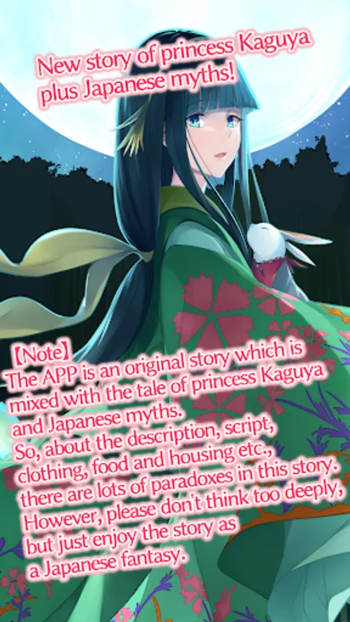 The APP is an original story which is mixed with the tale of princess Kaguya and Japanese myths. So, about the description, script, clothing, food and housing etc., there are lots of paradoxes in this story. However, please don't think too deeply, but just enjoy the story as a Japanese fantasy.
