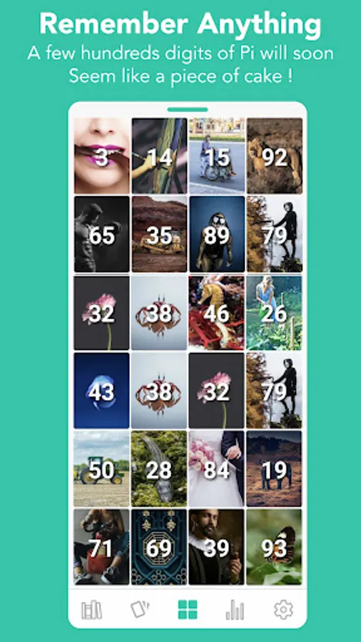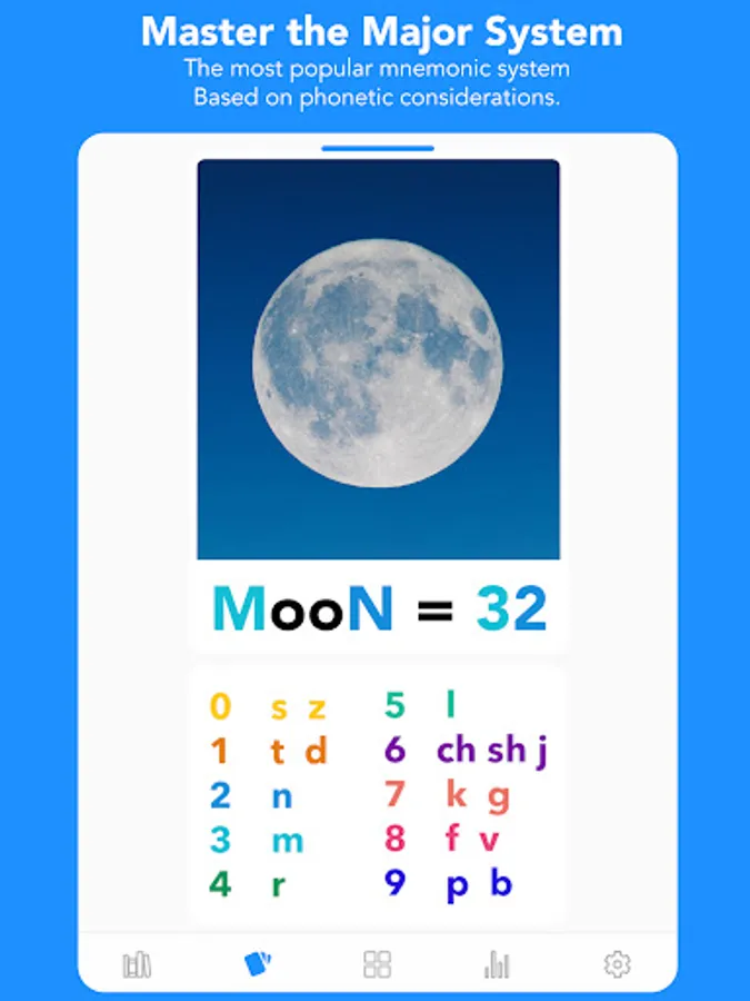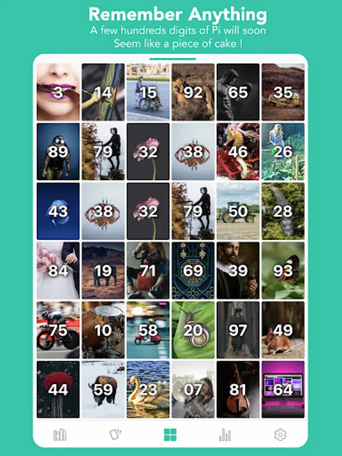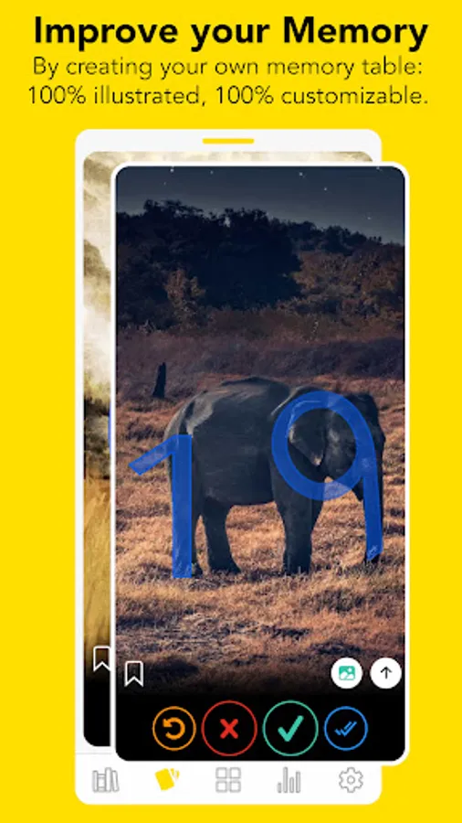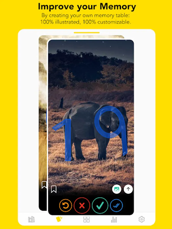In our app, everything has been designed to facilitate your memorization! Each number is associated with an image to solicit your visual memory. Pictures have been pre-selected following the Major system, but you can of course personalize each flashcard by adding your own images for even better memorization results!
