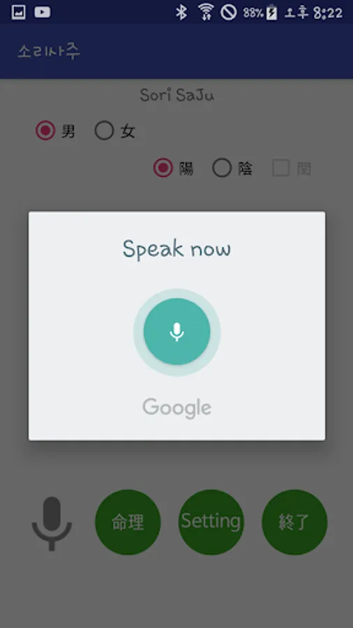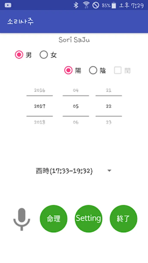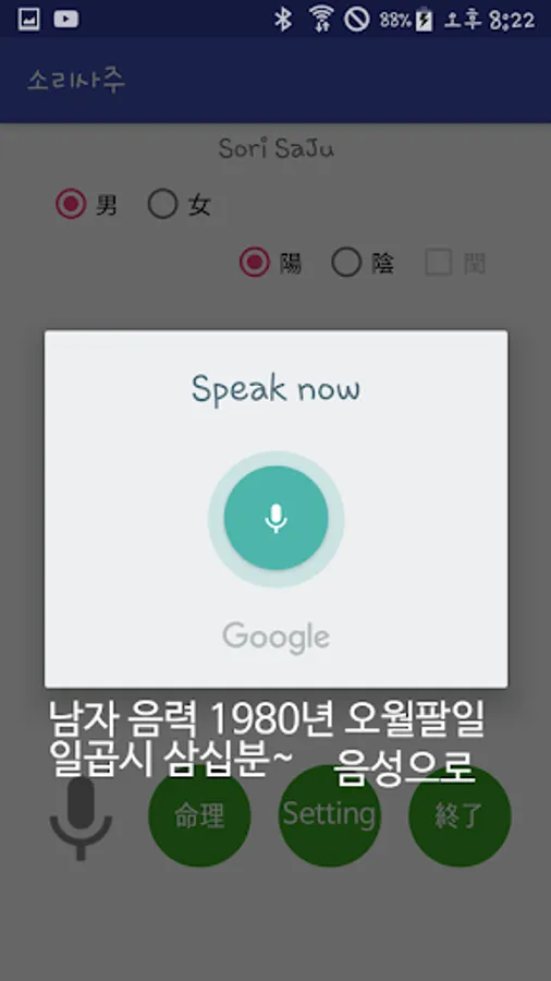 음성으로 '남자 음력 1980년 ㅇ 월 ㅇ 일 ㅇ 시 ㅇ분' 형태롤 말하면
