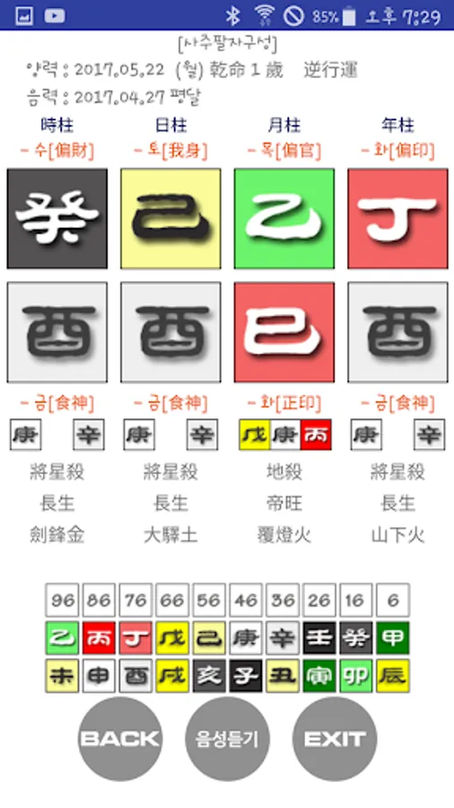 납음오행과 12운성 부분을 터치하면 각 주 별 납음오행과 12운성을 읽어주고