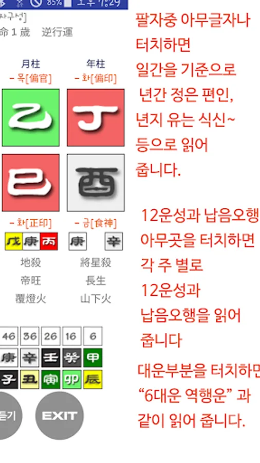 대운부분을 터치하면 '6대운 역행운' 형식으로 읽어 줍니다.