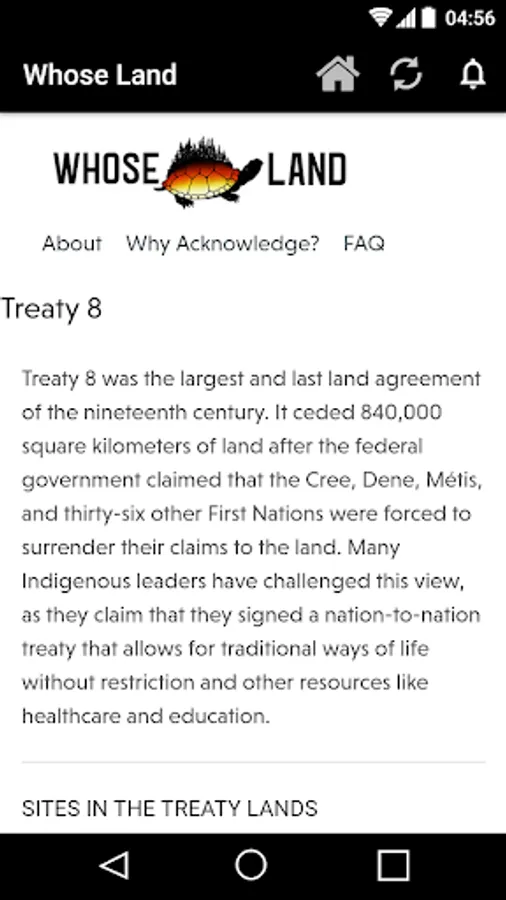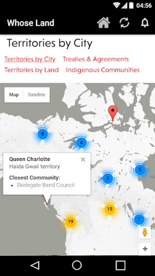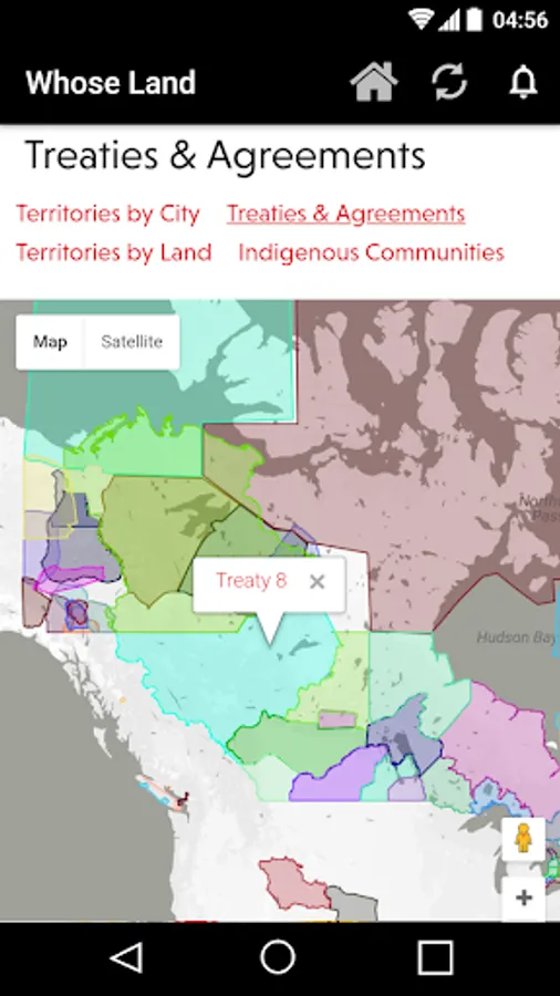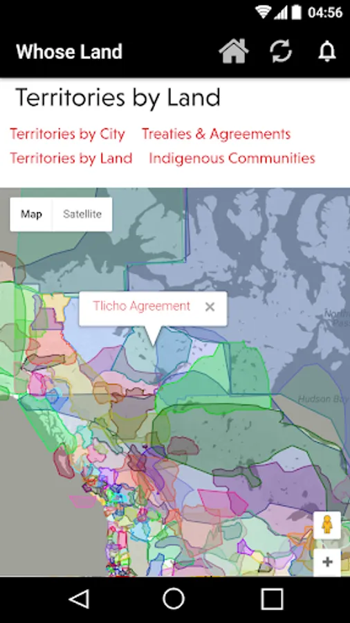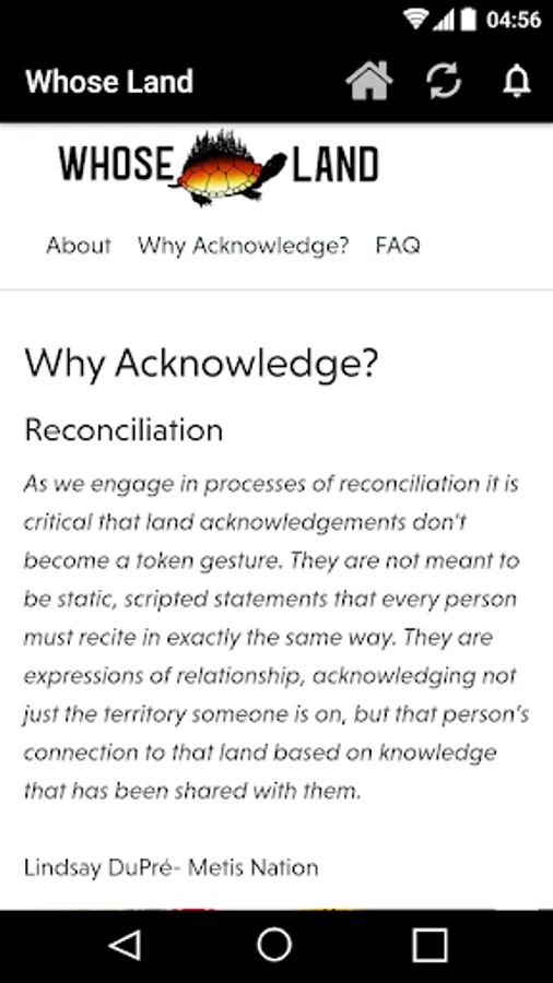 The app consists of six different maps of Indigenous territories, Treaties, and First Nations, Inuit, and Metis communities. Each community's location will eventually host a land acknowledgement video, and other information that the community would like to include on their page. The app will be used as an educational tool to create dialogue around reconciliation. It will be a starting point for conversation between Indigenous and non-Indigenous citizens across this country about land, territorial recognition and land acknowledgement.