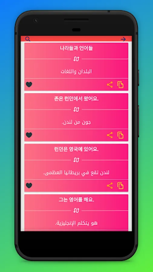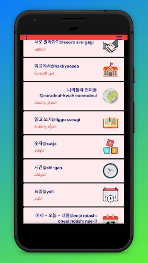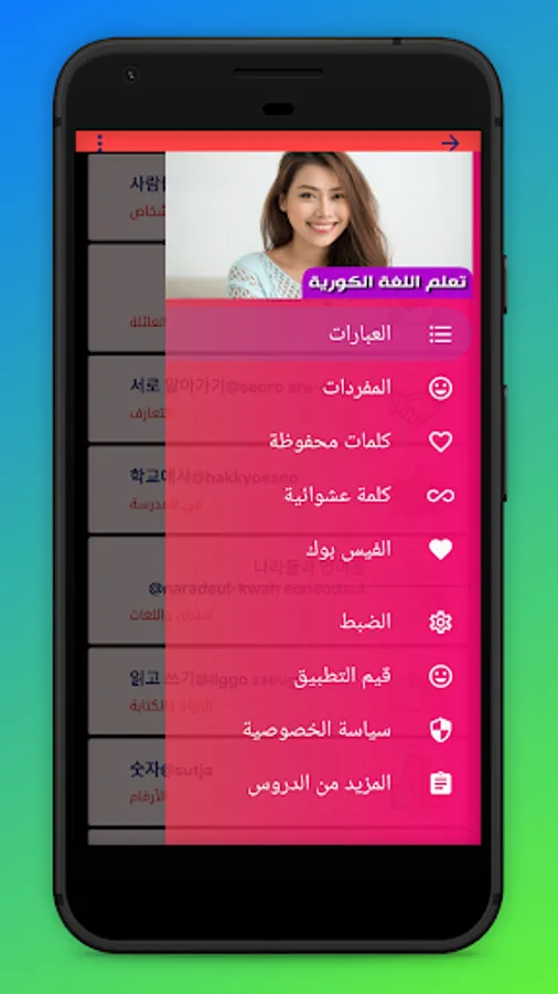 The application "Learn the Korean language in Arabic" is a program that helps you speak the famous Korean language, in addition to basic sentences in the Korean language, names, colors and some rules that help you translate Korean into Arabic.