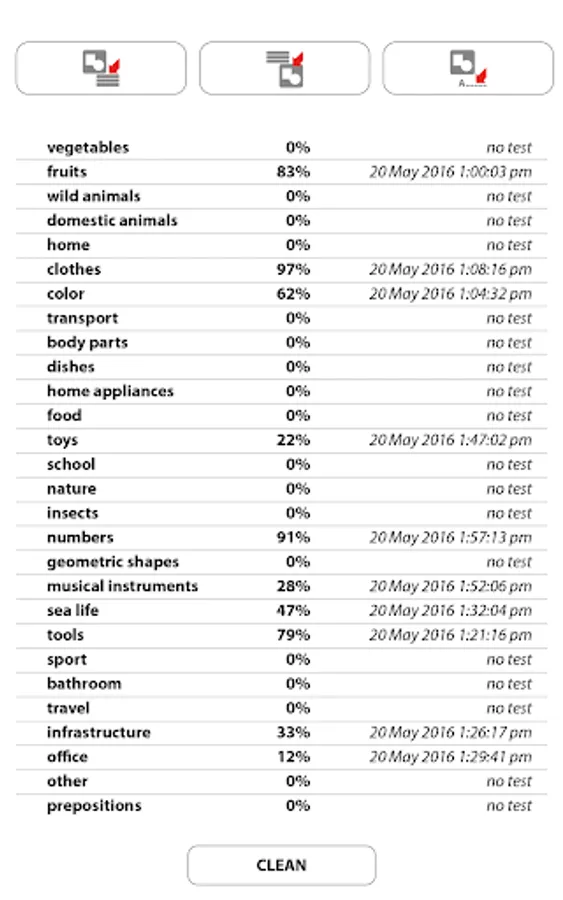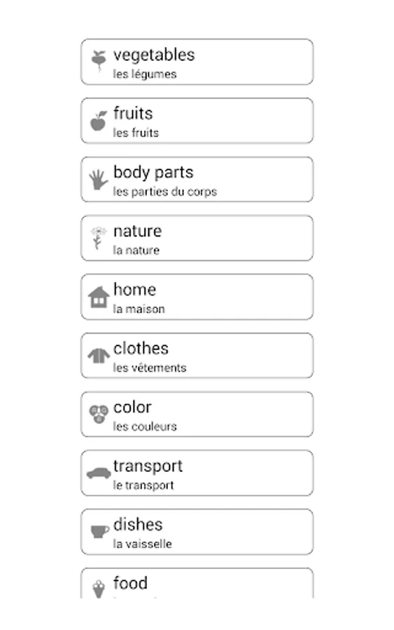 The app contains the following topics: vegetables, fruits, wild animals, domestic animals, animal body parts, birds, sea life, home, bathroom, clothes, colors, transport, human, body parts, tableware, home appliances, food, toys, school, nature, natural phenomena, insects, numbers, geometric shapes, musical instruments, tools, sport, summer sports, winter sports, travel, entertainments, office, infrastructure, shop, society, professions, information technology, prepositions.
