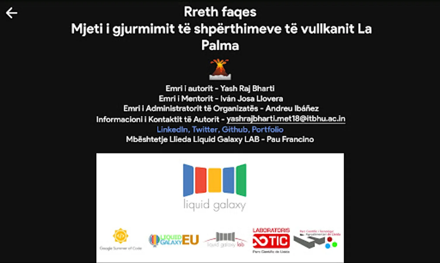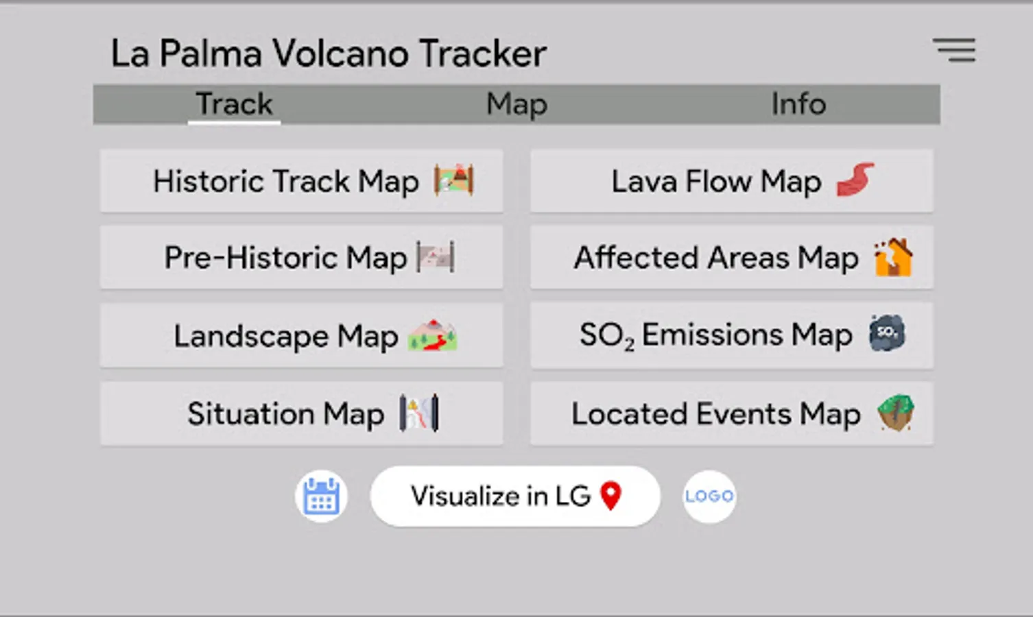 La Palma Volcano Eruption Tracking Tool is an app built on the Flutter framework that allows the Visualization of various Tracks, such as Historic, Lava Flow, Affected Areas, Pre-historic, Landscape, Sulphur Dioxide Emissions, Situation, and Located Events map, for La Palmas onto the Liquid Galaxy.