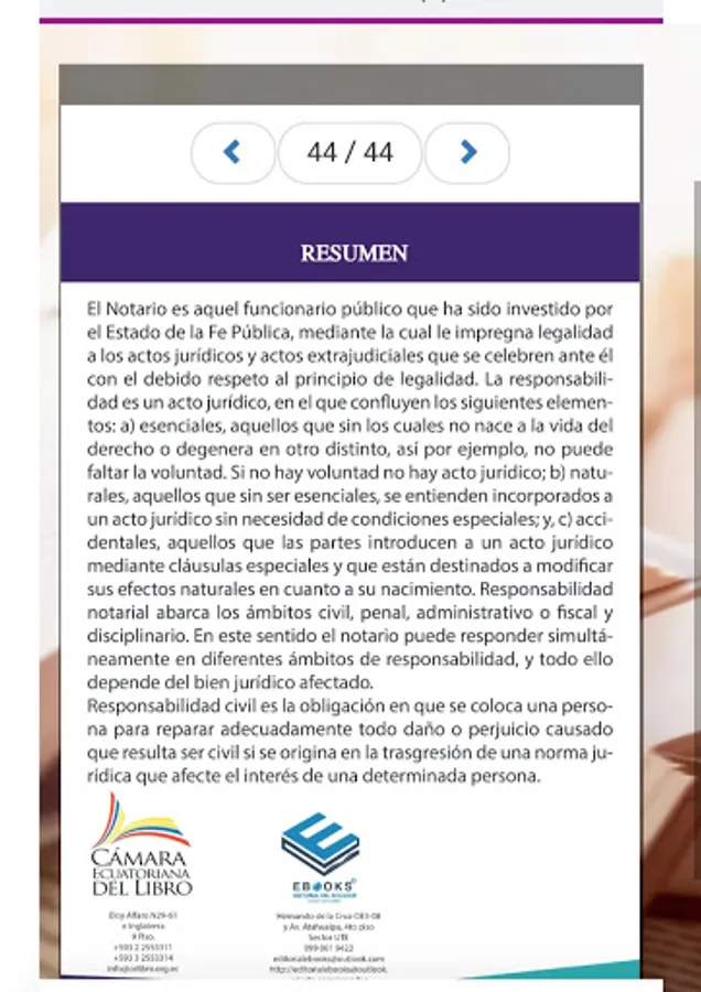 The Notary is that public official who has been invested by the State of Public Faith, through which he impregnates the legality of the legal acts and extrajudicial acts that are celebrated before him with due respect for the principle of legality. Responsibility is a legal act, in which the following elements converge: a) essential, those that without which the life of law does not arise or degenerates into a different one, thus, for example, the will cannot be lacking. If there is no will, there is no legal act; b) natural, those that without being essential, are understood to be incorporated into a legal act without the need for special conditions; and, c) accidental, those that the parties introduce to a legal act by means of special clauses and that are destined to modify its natural effects regarding its birth. Notarial liability covers civil, criminal, administrative or fiscal and disciplinary areas. In this sense, the notary can respond simultaneously in different areas of responsibility, and all this depends on the affected legal interest.