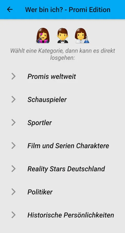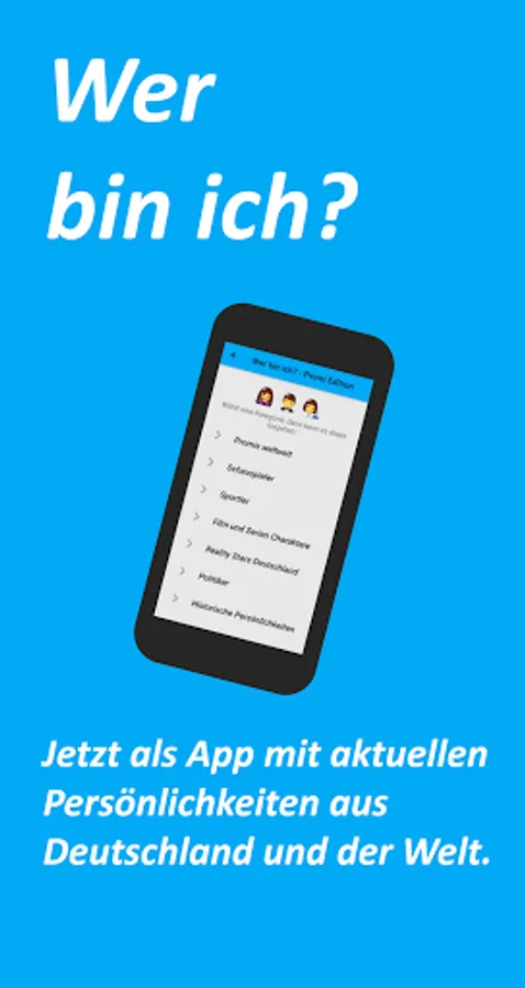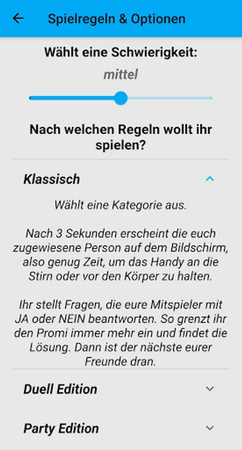 Then simply hold the smartphone in front of your forehead or body and ask questions that can be answered with "yes" or "no". Your fellow players answer these questions and so you narrow down the possible celebrities. If the term is guessed it is your turn and the fun continues. You can also play the Duel or Party Edition!