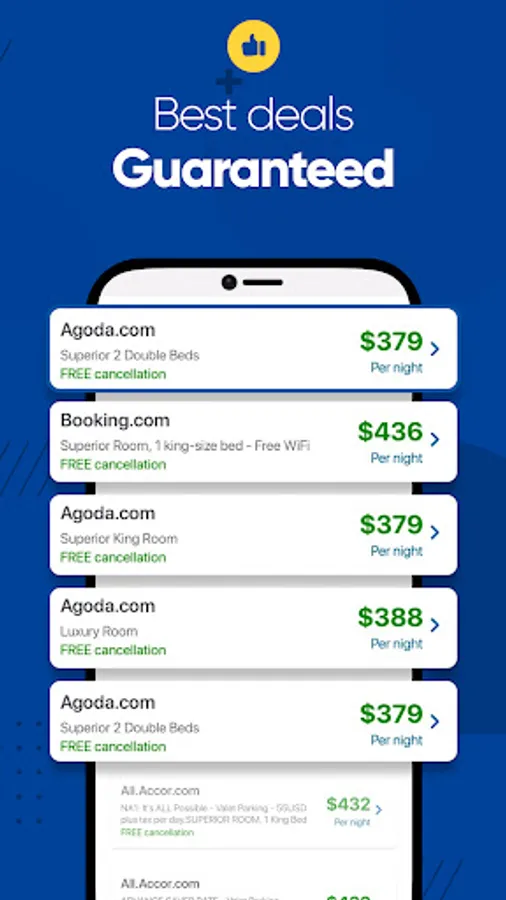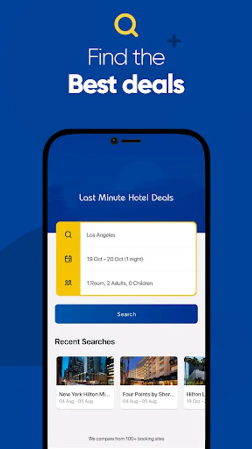 Last minute hotel deals app, search and compare best lastminute hotel booking deals and cheap hotels for your last-minute travel. Our hotel app provides the latest last minute deals by comparing online hotel booking providers like Lastminute, Hotel com, Hotels tonight, Hotwire com, Priceline, Orbitz, Booking com, Airbnb, Expedia, Reddoorz, Oyo hotel, Hotelscombined, Travelocity, Vrbo, and many more. Book hotels with great offers and discounts to make your travel budget-friendly.
