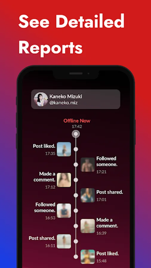 🔥 You can see the likes and comments of the person you want to learn, people he/she follow and people who follow she/he with reports. You stay up to date with daily notifications!