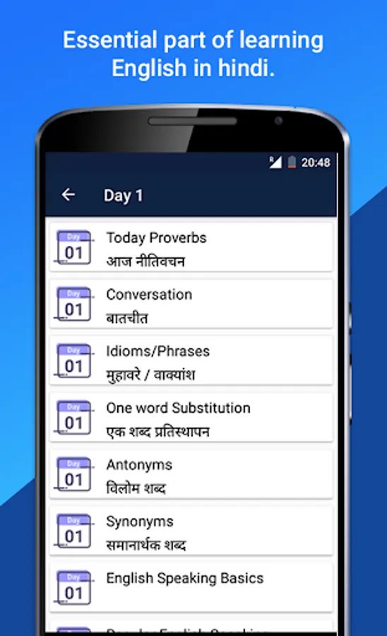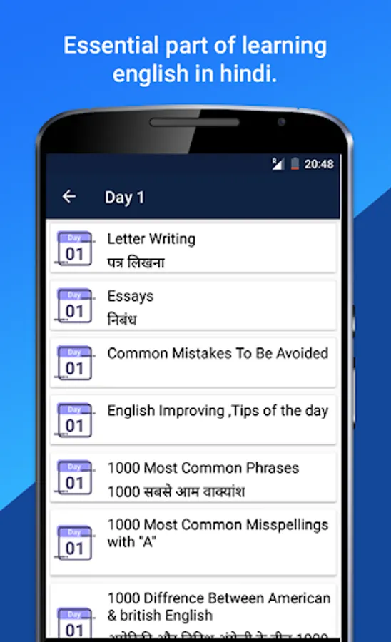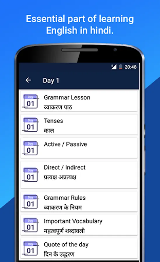 * Every English learning chapter is sufficiently provided with information to ensure that your speaking fluency gets further enhanced - learn hindi to english and english to hindi.