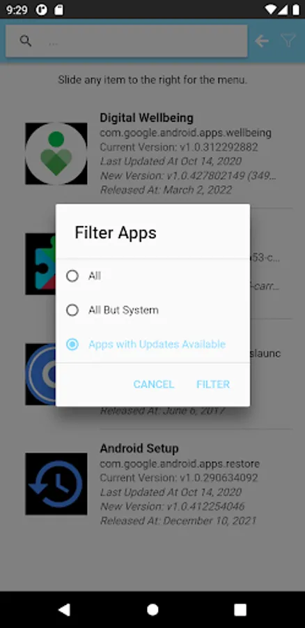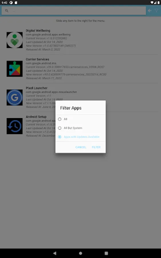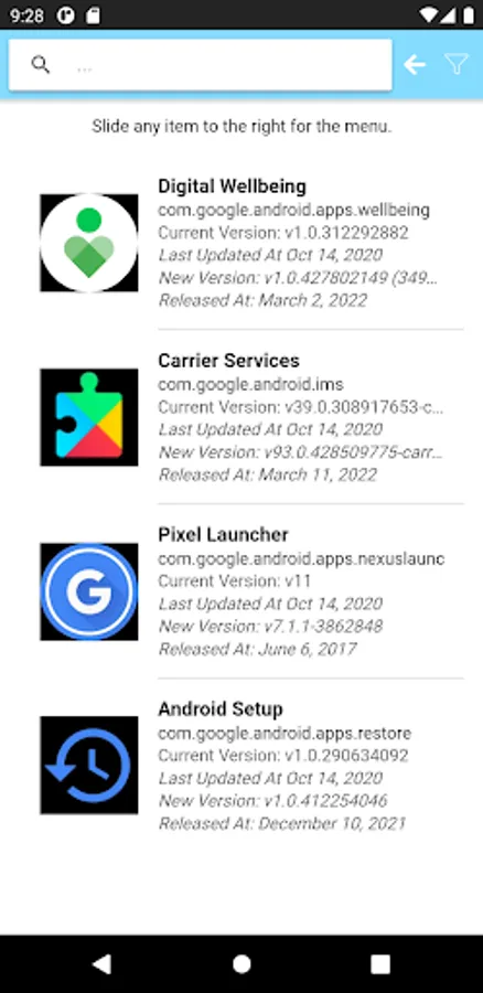 With Update Man you can easily get all the information related to installed applications to your android device. Using the search capability you may search the app you are looking for with its name or package name. Also you may filter the apps that are non-system or that has updates. UpdateMan also supports to export application specific detailed information and the apk of the application itself.