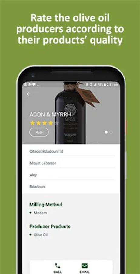The app serves a dual purpose by linking and facilitating contact between consumers and local olive oil millers/producers thus solely promoting Lebanese high quality olive oil.