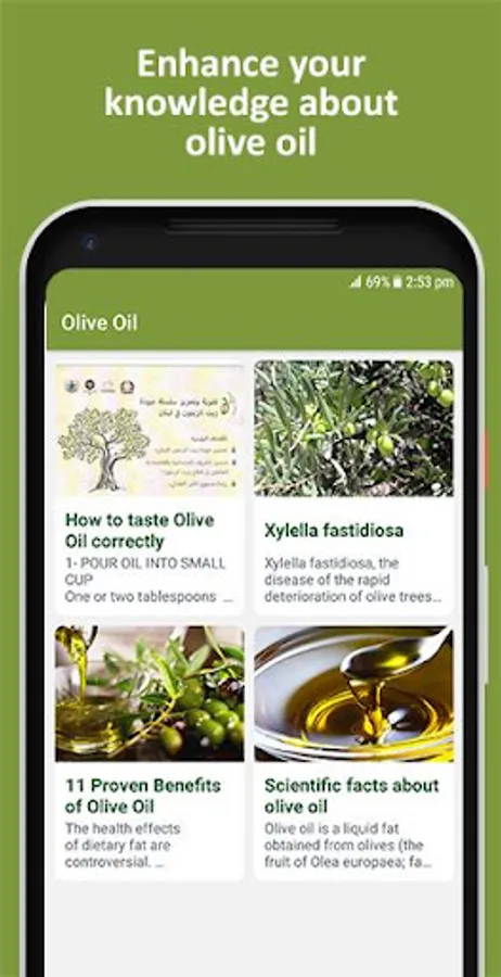 The app aims to raise consumer awareness on high quality olive oil, consequently increasing the consumption and encouraging local production.