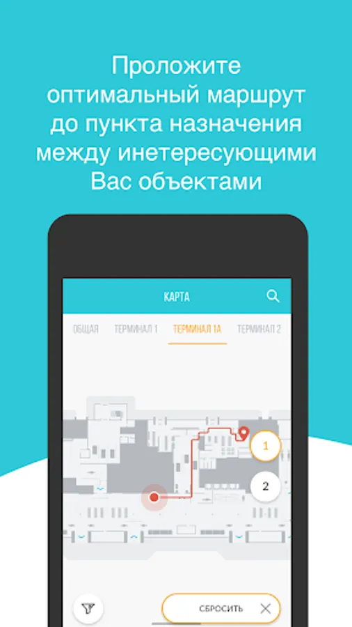 - The interactive scheme of the airport allows you to build routes between the objects you are interested in.