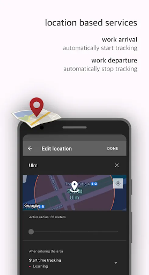 • Automatic starting and stopping on workplace arrival or departure. By using your location, connected WiFi networks or NFC you can record times without having to operate the app.