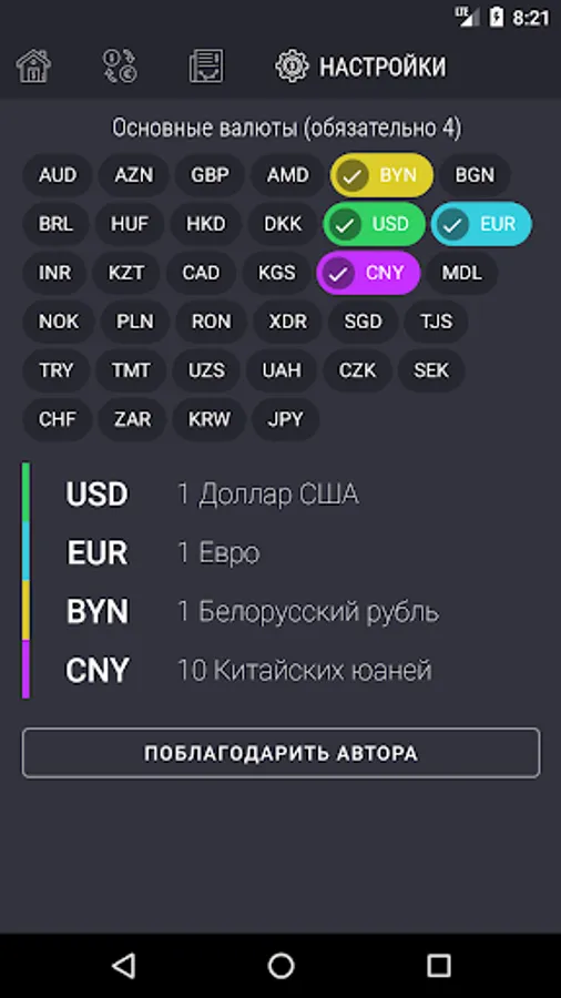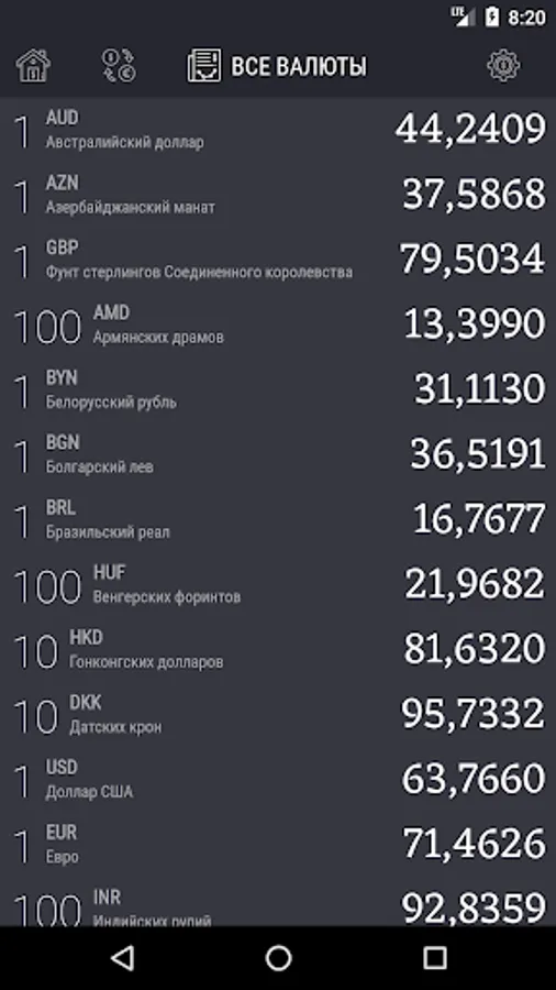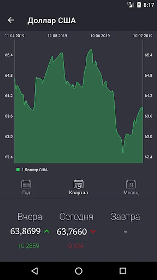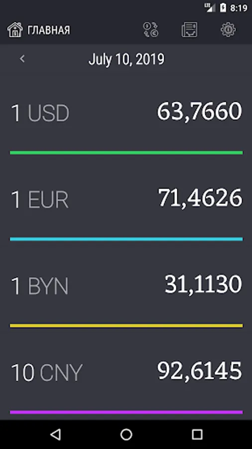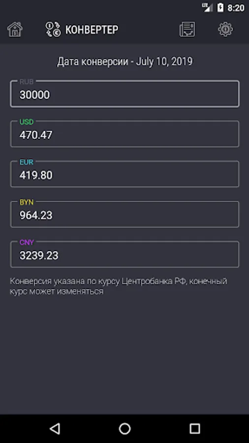 For convenience, you can set up four main currencies that will be displayed on the main tab, as well as in the converter. On the main screen of the application, you can find out the exchange rate of the main currencies for a certain date, as well as go to detailed information about the currency - you can see the graph of currency changes for the week, month and year. Here you will also see the rate of the Russian ruble against a given currency for yesterday, today and tomorrow, as well as the difference in the rate compared to the previous day.